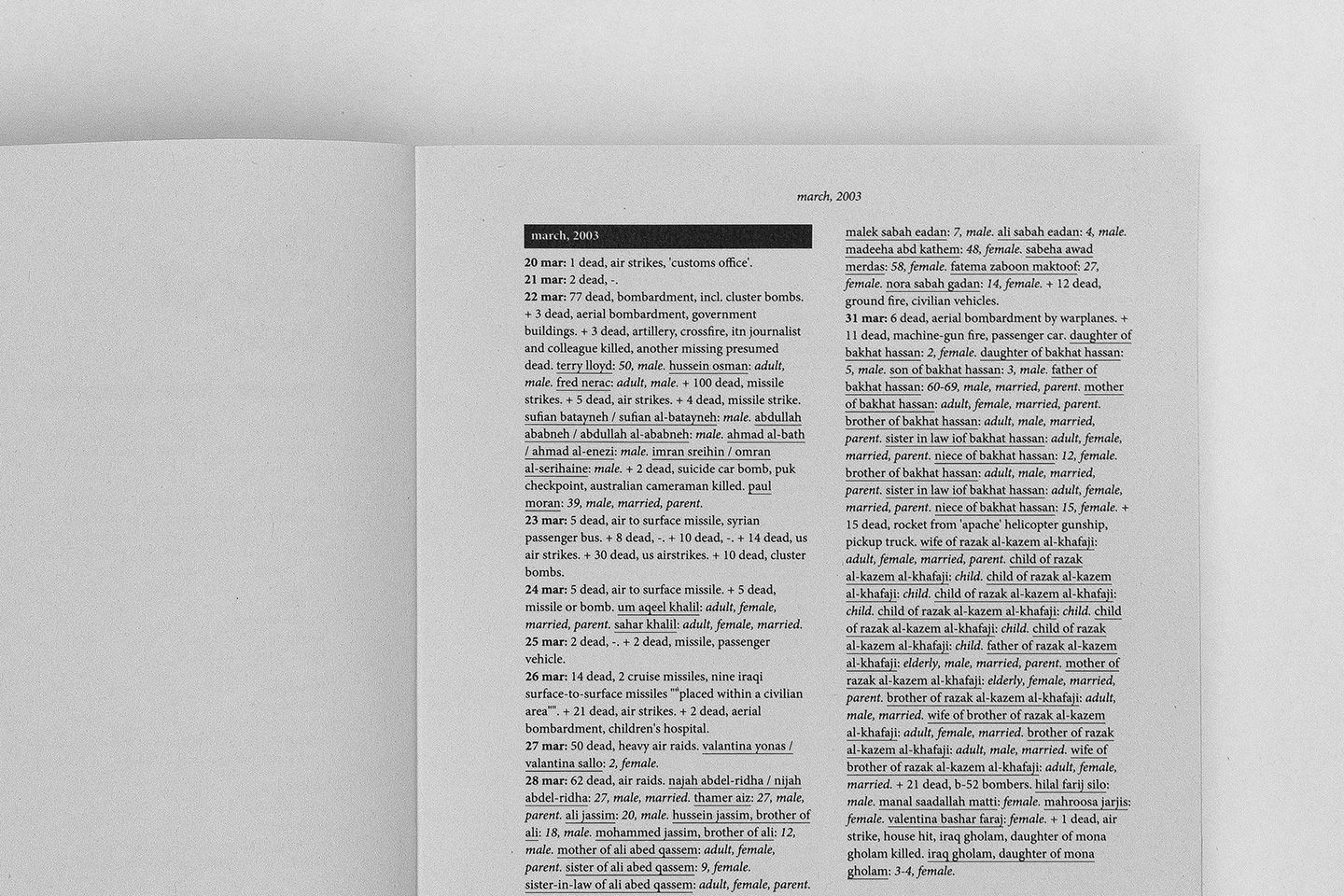 This book lists violent incidents and accompanying civilian deaths in Iraq between 20 March 2003 and 18 December 2011.