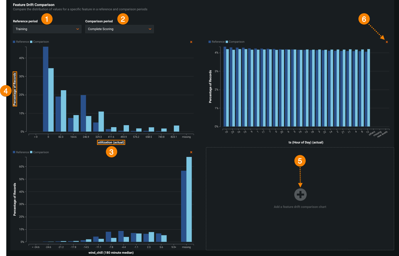 Users can select one or more features from the heat map to view a Feature Drift Comparison chart, comparing the change in a feature's data distribution between a reference time period and a comparison time period to visualize drift. This information helps you identify the cause of data drift in your deployed model, including data quality issues, changes in feature composition, or changes in the context of the target variable.