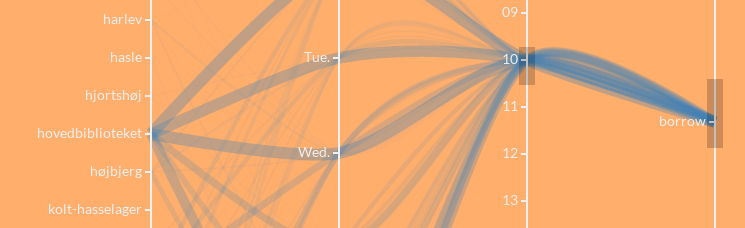 The municipality of Aarhus administrates 19 different public libraries distributed throughout the greater Aarhus area. Since the beginning of 2013 the time and place of all individual loan and borrow transaction have been made available for the general public through the Open Data Aarhus initiative.