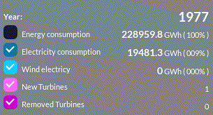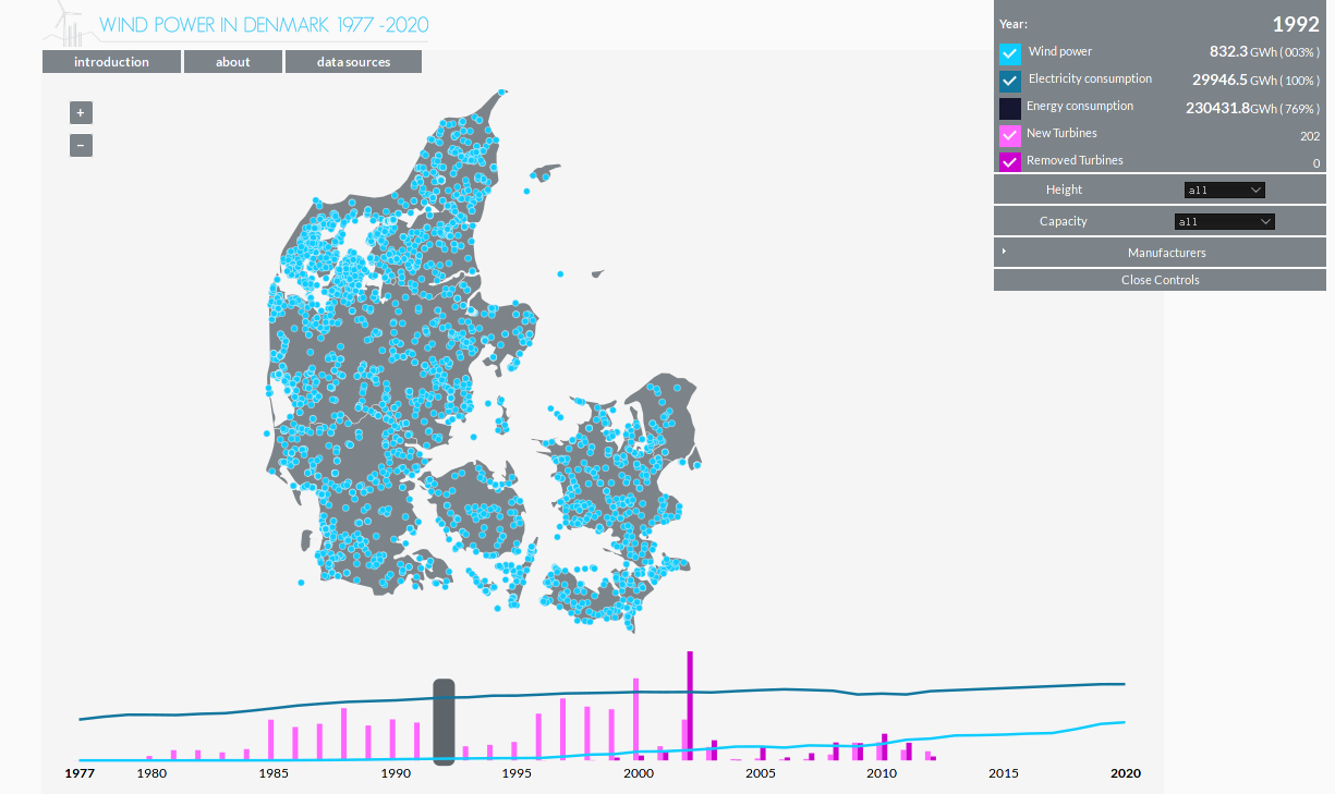 WIND ELECTRICITY IN DENMARK 1977-2020 shows patterns of wind turbines installed – and taken down – in Denmark over the years in combination with total consumption of electricity and gross energy.